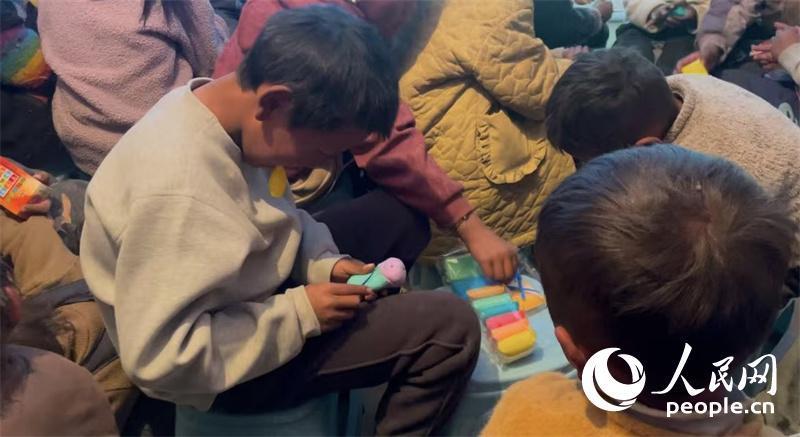 “刚见到孩子们时,他们看起来情绪紧张。”社工久米旦增说,“我们利用帐篷以及带来的绘本、水彩笔、彩泥等物资,给孩子们搭建了‘儿童之家’。”