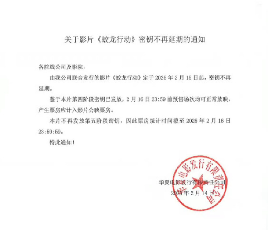 另从华夏电影发布的通知可知,《蛟龙行动》密钥不再延期,2月17日之前预售的场次可以正常放映,之后将不再发放密钥,意味着从2月17日开始,《蛟龙行动》正式撤档。