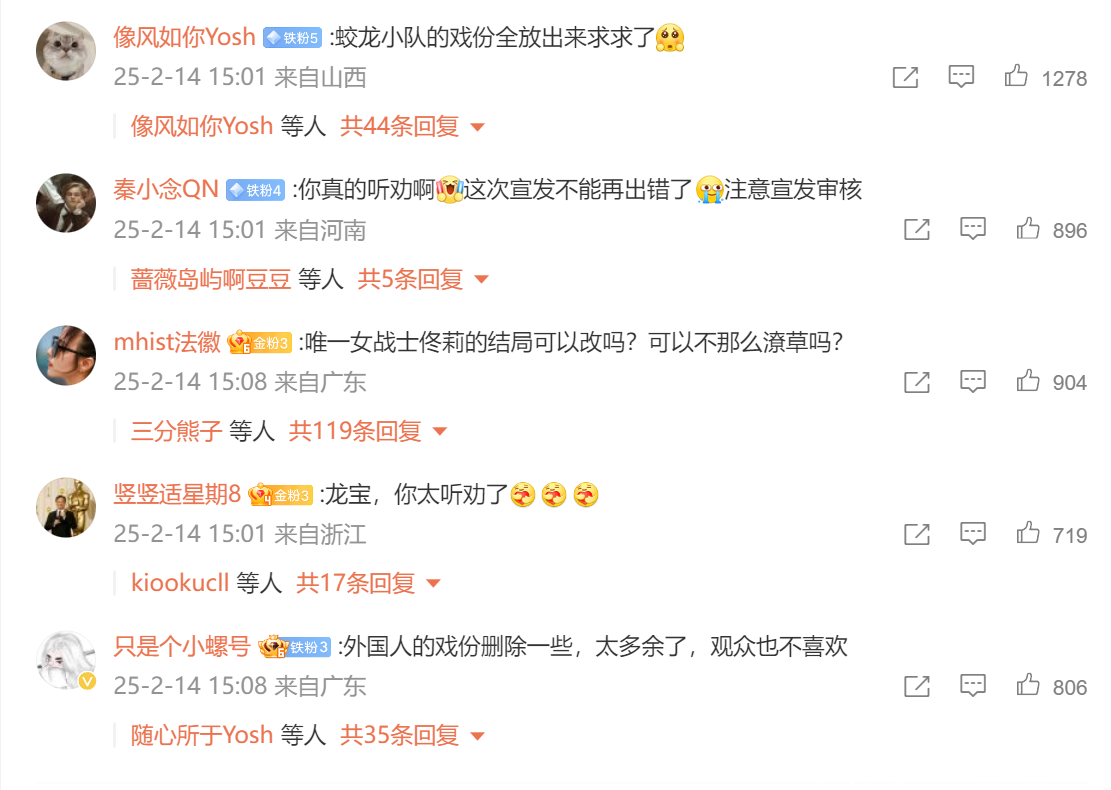《蛟龙行动》上映的这半个多月,收获了观众认可和掌声的同时,也收到了很多反馈,撤档公告的下面,也有大量粉丝留言,给博纳提意见,比如要求将蛟龙小队的戏份全放出来、修改佟莉的结局、删减外国人的戏份等等。
